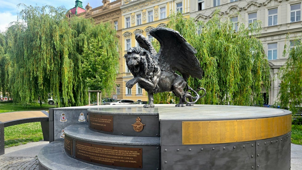 Bronzelöwe, 0.5 Tonnen schwer, im Gedenken an den Einsatz der tschechoslowakischen Piloten im 2.Weltkrieg, von Colin Spofforth.